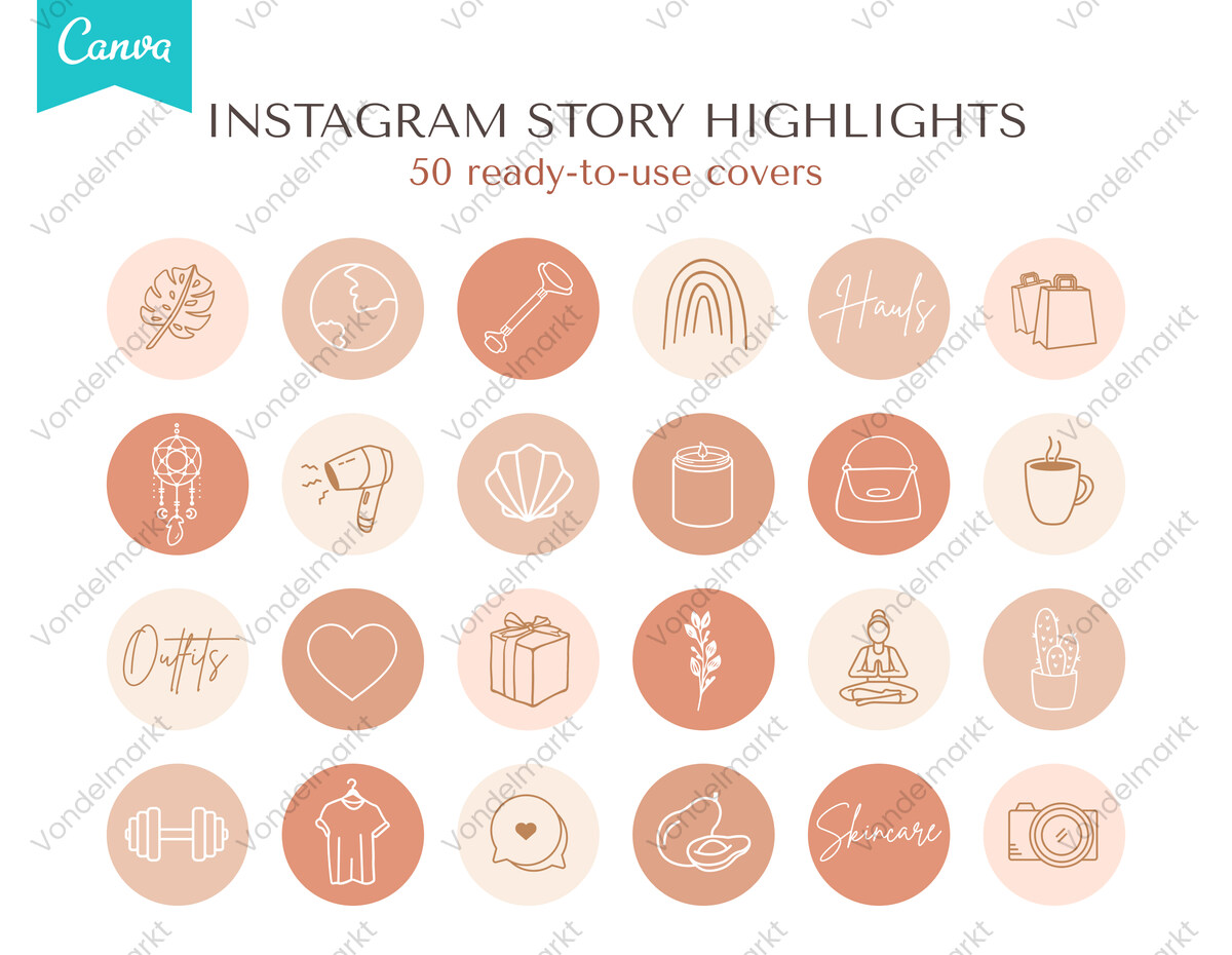 50 ready-to-use Instagram Story Highlight Covers. You can change the background color and the color of the icons in Canva through a link you receive after purchase.